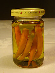 Chili i olie er en god måde at forlænge chiliers holdbarhed. De mange flotte farver du kan få chili i, gør også at du nemt kan lave en sød værtindegave. Lav små glas med én slags chili, eller lav lidt større glas med blandede chili, det er meget dekorativt.