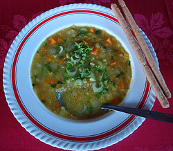 Hvis der tilsættes lidt mindre mængde bouillon, kan suppen bruges som dahl sammen med ris.